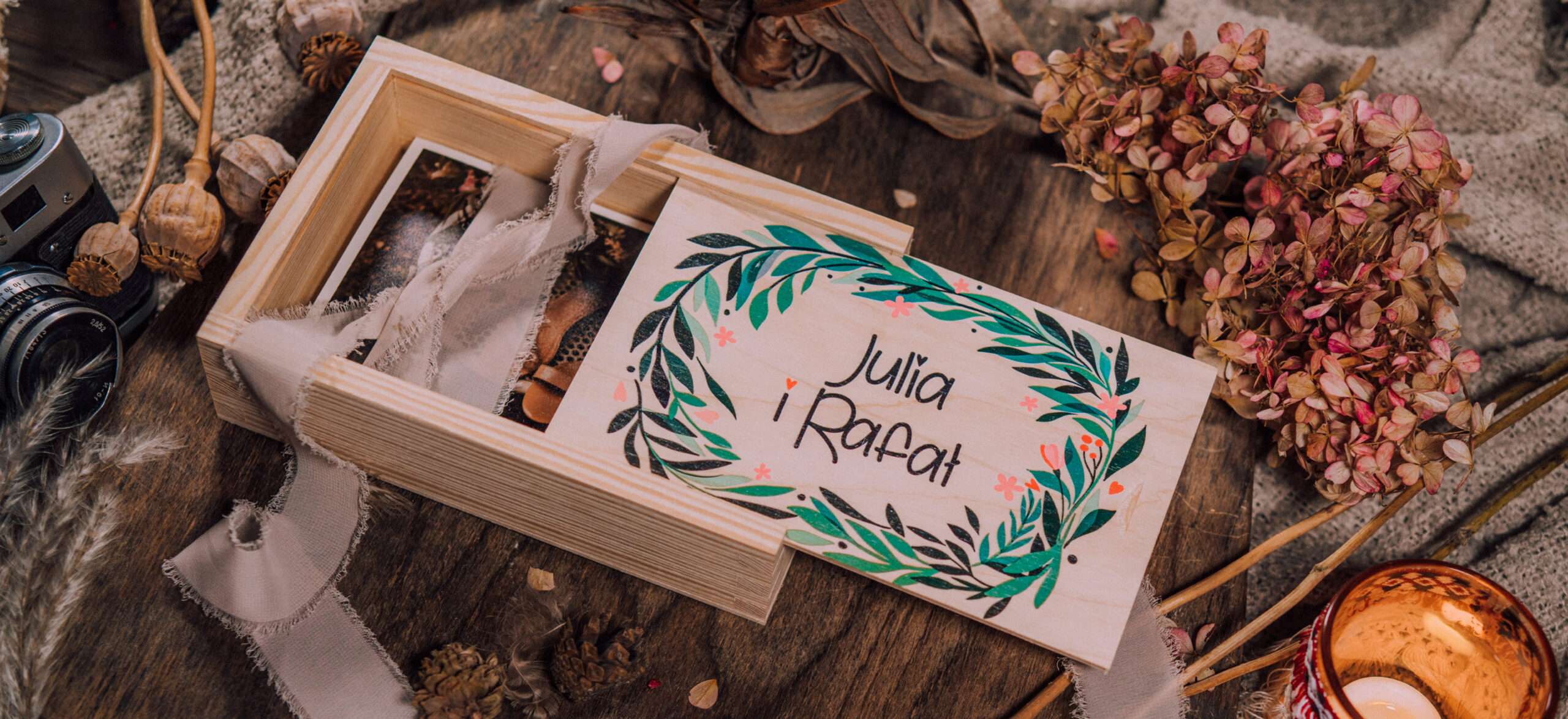 Wooden box from basic collection with transparent lid for 10x15cm photos and USB