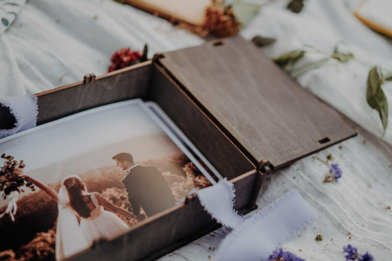 The price includes: a wooden box for photos, a laser engraving on the lid and forest filling.