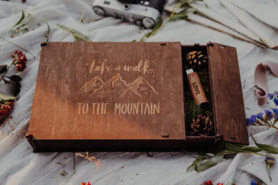 The price includes: a wooden box for photos, USB compartment, a laser engraving on the lid and forest filling.