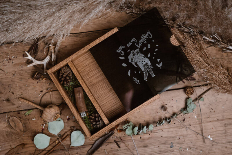 The filling used for the boxes is natural moss. On top of it we put cones and coniferous branches. It is thanks to this procedure – to quote your statements – “It smells like a forest”! In addition, many studies have proven that fragrances evoke memories. That is why the forest filling serves as a scent memory. Viewing photos becomes a family ritual that can be recalled during contact with the forest, e.g. during a walk.