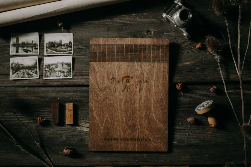 Configure productIt holds approximately 20 A4 sheets. The folder is made of pine plywood, you can order it in two colors: oak (shade of brown) and gray. The offer box opens vertically, a special wooden hinge has been designed for this, where the wood has been cut with a laser method. A circle is cut out at the bottom of the folder, which you can easily lift the pages with your finger to take out the contents. We make an engraving on the front and back of the document, you can design it in our configurator (tab: configurator). We recommend folders especially for meetings with clients, as an aesthetic form of presenting an offer or signing a contract.