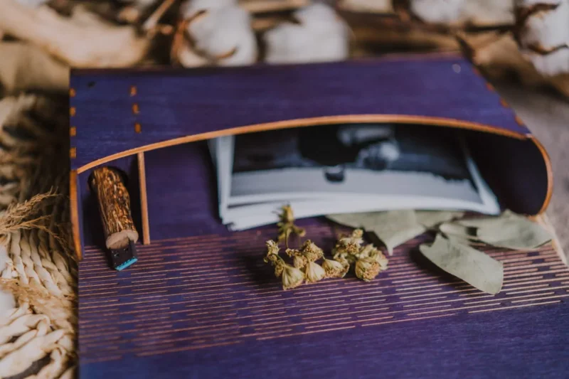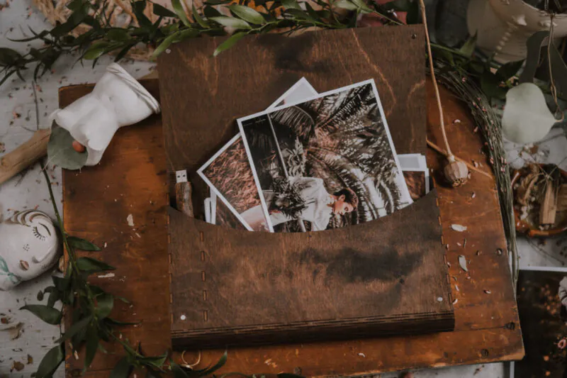 The price includes: a wooden box for photos and a laser engraving on the lid.