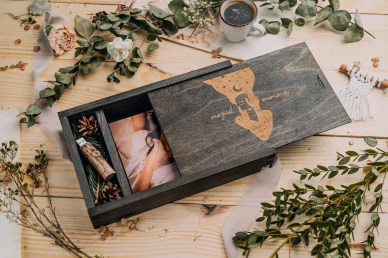 The price includes: a wooden box for photos, an additional USB compartment, a personalized laser engraving on the lid, forest filling with moss / cones, painting and the smell of the forest.