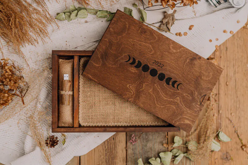 The price includes: a wooden box for photos, an additional USB compartment, a personalized laser engraving on the lid, jute pillow for USB and fabric photo pad